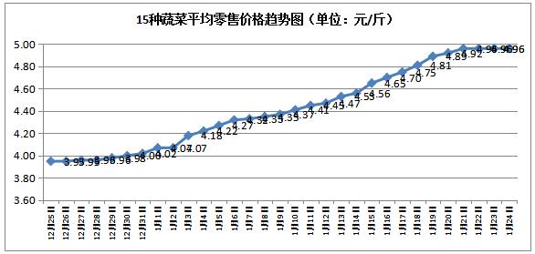 在监测的15种蔬菜平均零售价格为4.96元/斤,与1月21日(除夕)持平,15种蔬菜中有2个品种价格上涨,2个品种价格下降,11个品种价格持平。