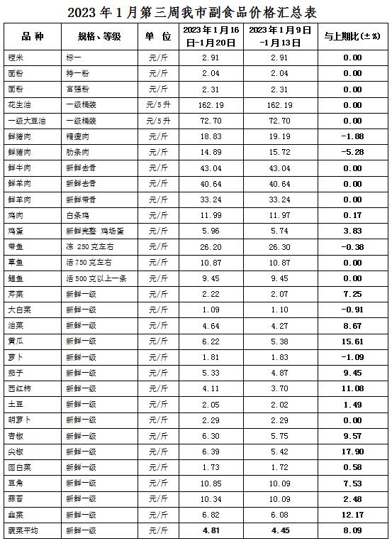 在监测的15种蔬菜周平均零售价格为4.81元/斤,每斤比上周上涨0.36元,涨幅8.09%,15种蔬菜中有12个品种价格上涨,2个品种价格下降,1个品种价格持平 。