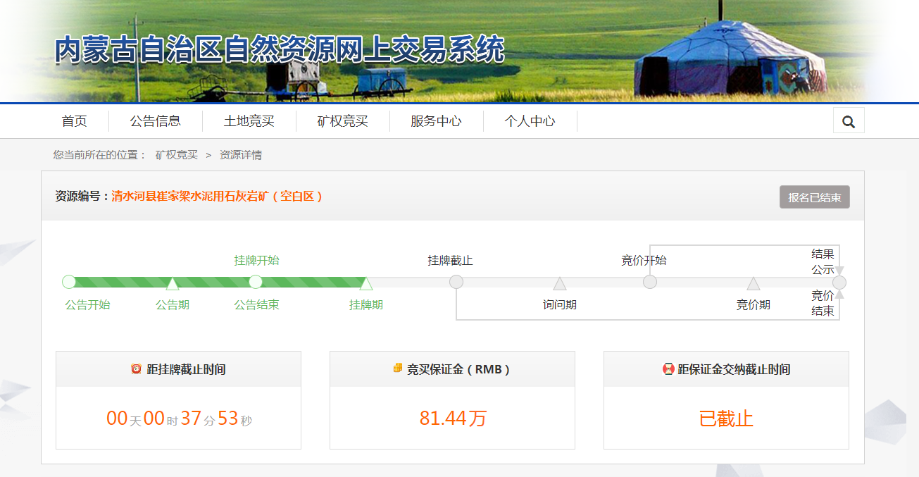 9月5日下午,清水河县崔家梁水泥用石灰岩矿(空白区) 在email365_365bet娱乐登录_365bet亚洲真人公共资源交易服务中心完成挂牌出让,成交价167.88万元,矿区面积0.0946平方千米,保有资源量247.40万吨。