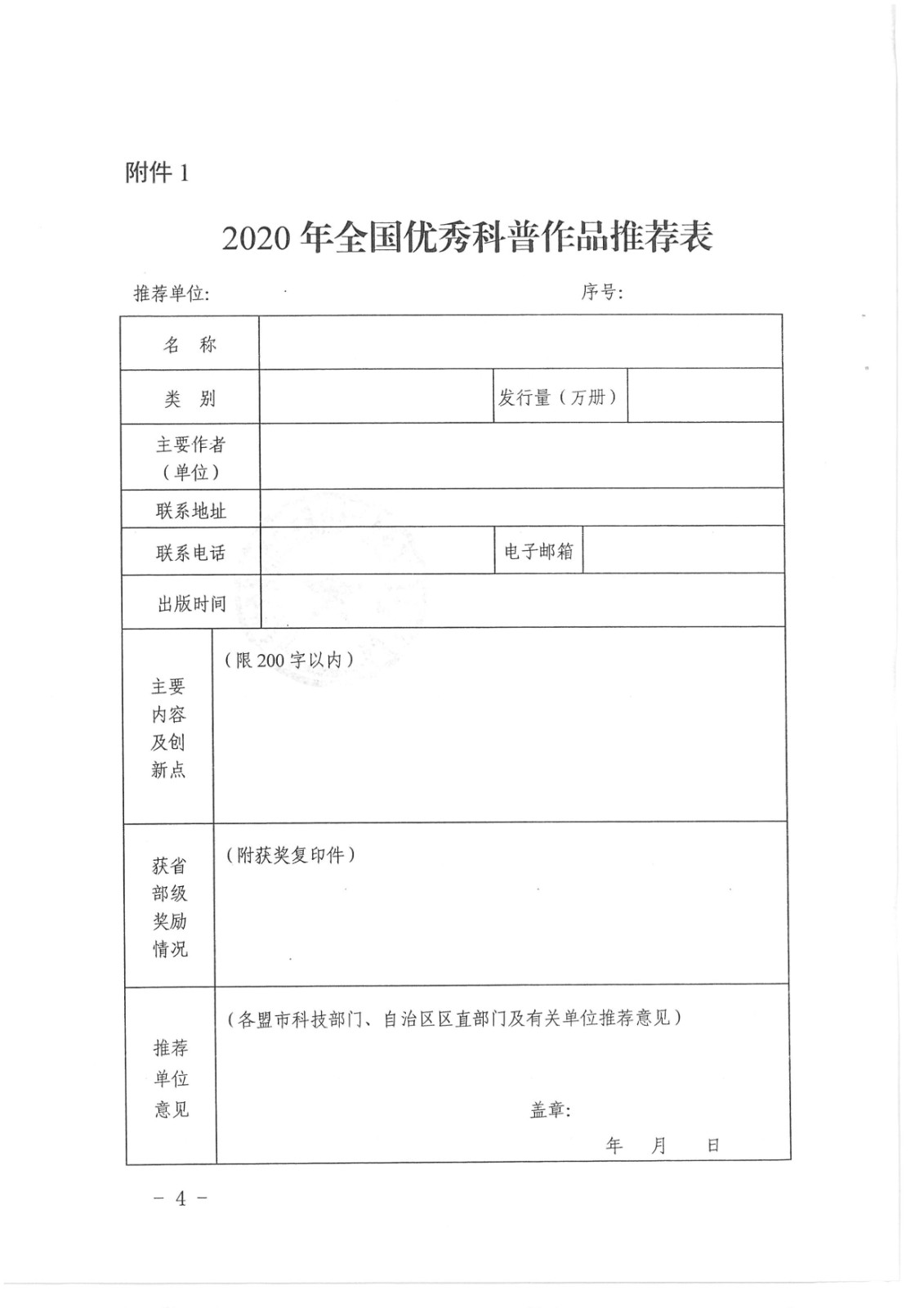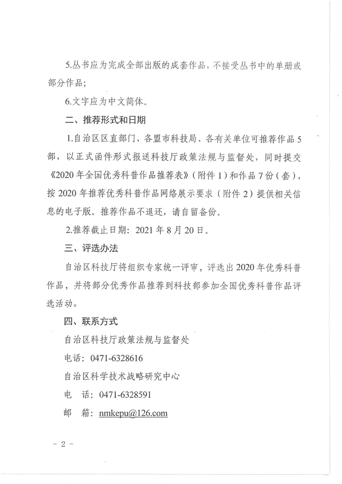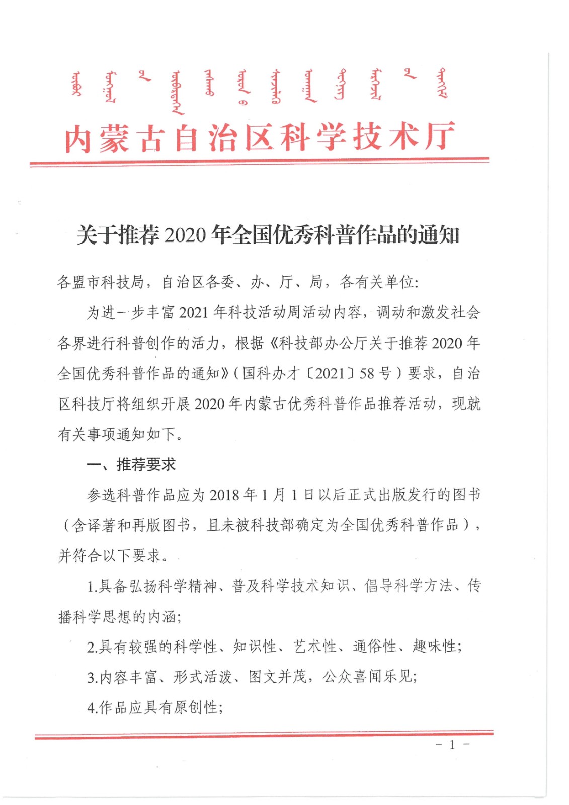 现将内蒙古自治区科技厅《关于推荐2020年全国优秀科普作品的通知》转发你们,请各单位于8月16日前将2020年优秀科普作品名单行文推荐至呼市科技局,并按通知提交材料,同时将电子版报指定邮箱。
