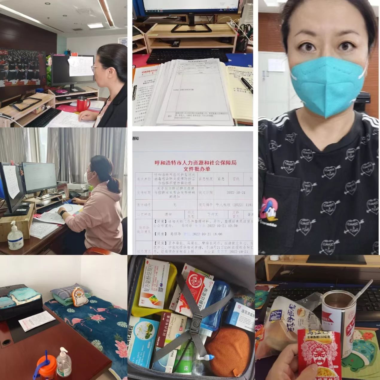 在单位驻守期间,谢芳同志每天参与奈伦国际大楼消杀工作,帮助物业发放抗原,筹备抗疫物资。生活中遇到了困难她都一一克服,没有暖气就多盖几层毛毯,没有三餐就自己动手做饭。尽管环境艰苦、任务繁重,她又说“放心吧,不用担心,我能行!”