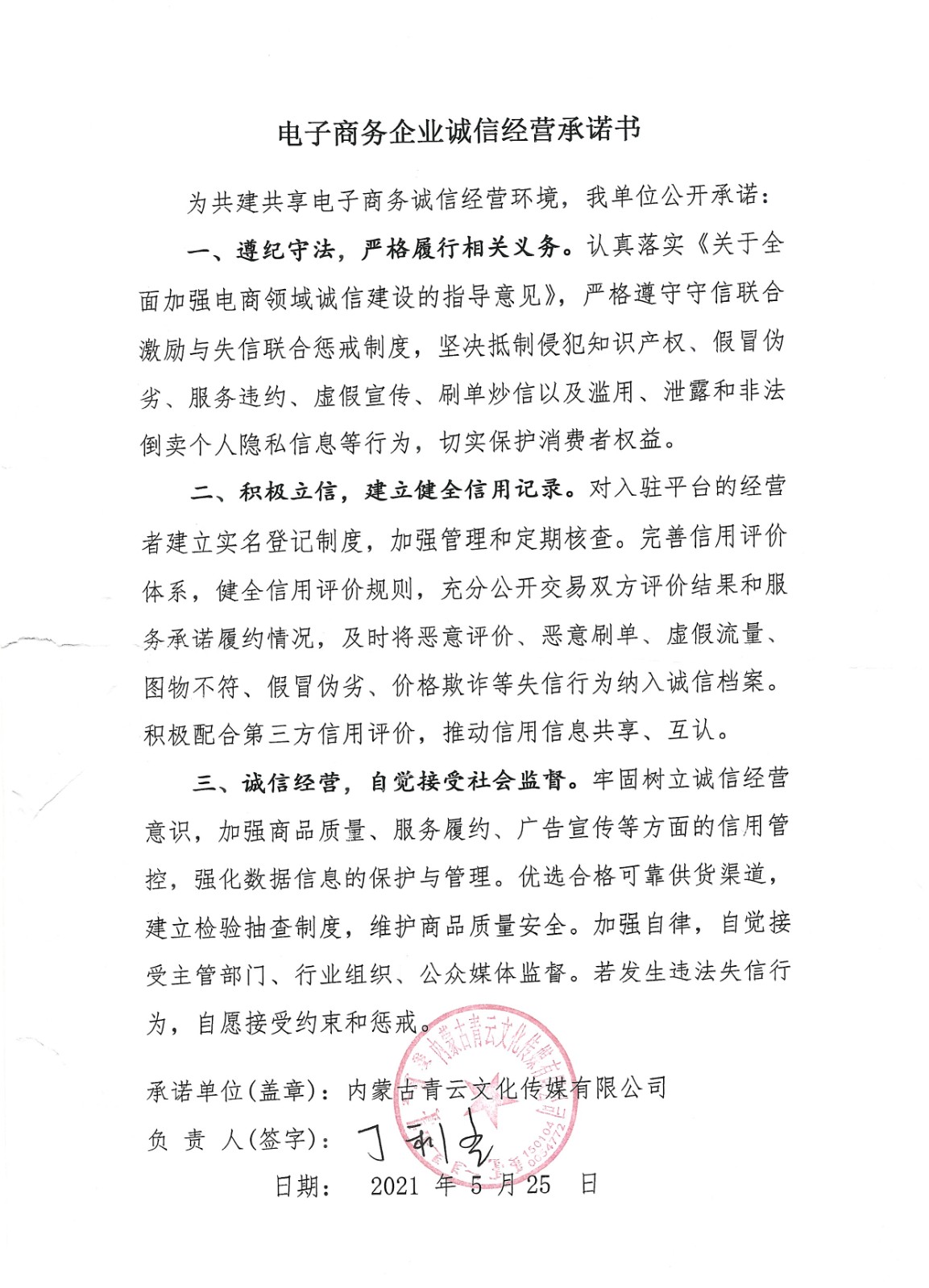电子商务企业诚信经营承诺书—青云文化