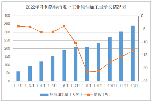 2022年,全市规模以上工业原油加工量同比下降13.4%,全年降幅呈收窄态势。自10月份以来,当月加工量均高于同期,持续保持在正增长区间。