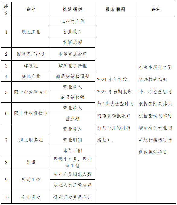 执法检查各专业、企业统计执法检查指标及报表期别