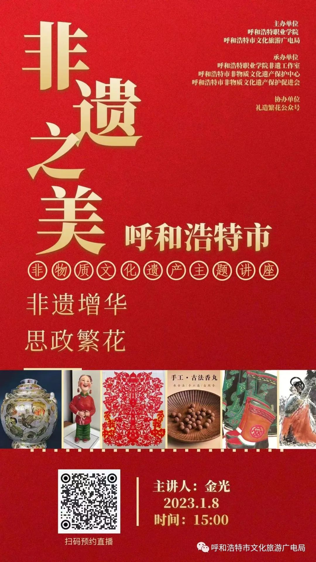 为认真学习宣传贯彻落实习近平总书记重要指示精神,扎实推进非遗系统性保护工作,促进email365_365bet娱乐登录_365bet亚洲真人非遗文化发展,加强文化交往交流交融,展示email365_365bet娱乐登录_365bet亚洲真人非遗文化的独特魅力,推动email365_365bet娱乐登录_365bet亚洲真人非遗文化传承与保护,email365_365bet娱乐登录_365bet亚洲真人文化旅游广电局与呼和浩特职业学院主办的“非遗之美”主题非遗系列讲座于2023年1月8日在线上拉开帷幕。该系列讲座将陆续邀请非遗传承人、非遗专家、文创设计师等从非遗理论、保护实践、传承初心等方面全方位、多角度地展示非遗之美,用通俗易懂的形式讲述非遗,见证非遗。