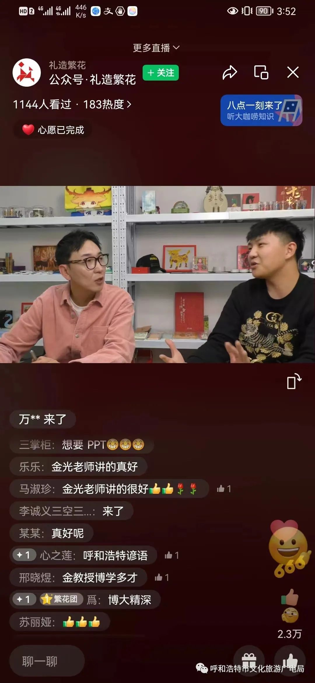 在首次讲座中,非遗专家通过“什么是非物质文化遗产、青城记忆、非遗之美、非遗文创”四个方面,阐述了非遗理论知识、email365_365bet娱乐登录_365bet亚洲真人非遗保护现状及非遗文创发展等内容。呼和浩特职业学院师生、非遗传承人、非遗项目保护单位负责人、社会人群等2千余人收看此次直播讲座,获得点赞5万余次。