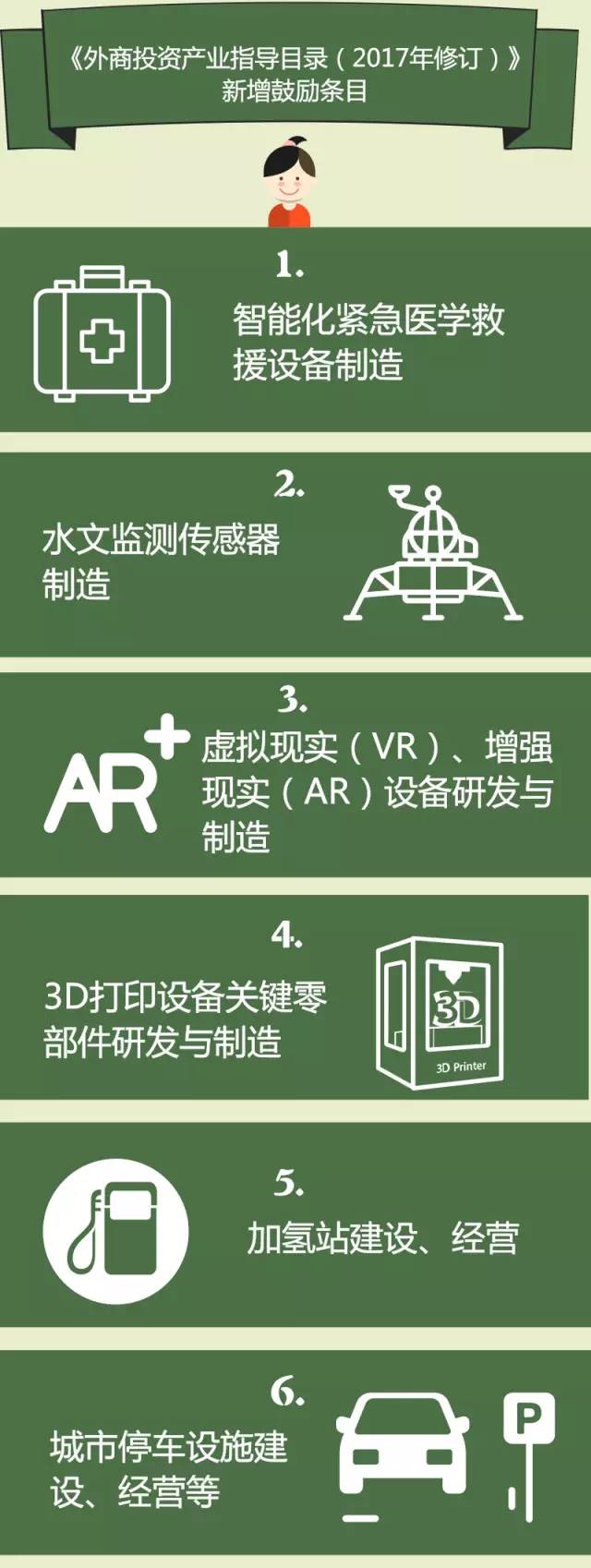 根据国家发展改革委、商务部今年6月份发布的《外商投资产业指导目录(2017年修订)》,7月28日起在全国范围内实施外商投资准入负面清单。2017年版《目录》鼓励类条目共348条,与2015年版《目录》相比,新增6条,删除7条,修改35条。
