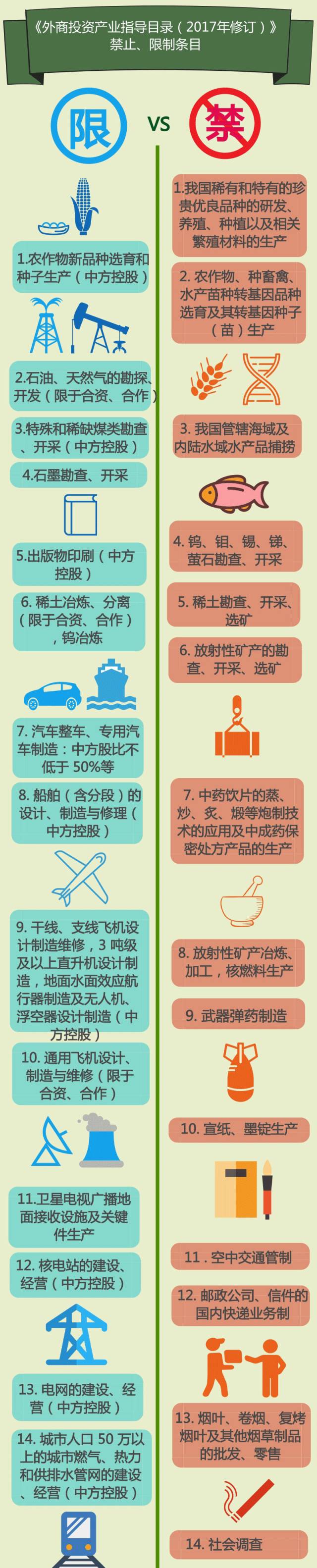 2017年版《外商投资产业指导目录》进一步减少了外资限制性措施,保留63条,比2015年版《目录》93条限制性措施减少了30条。负面清单之外的领域,原则上不得实行对外资准入的限制性措施,外商投资项目和企业设立实行备案管理。